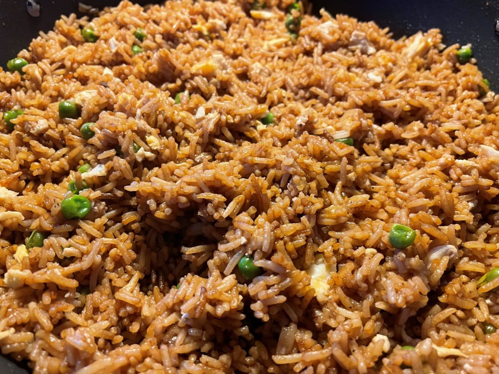 • Tillsätt soja- och ostronsåsblandningen. Blanda ordentligt. Låt gärna riset bli krispigt genom att låta det få gotta till sig utan omrörning en stund.