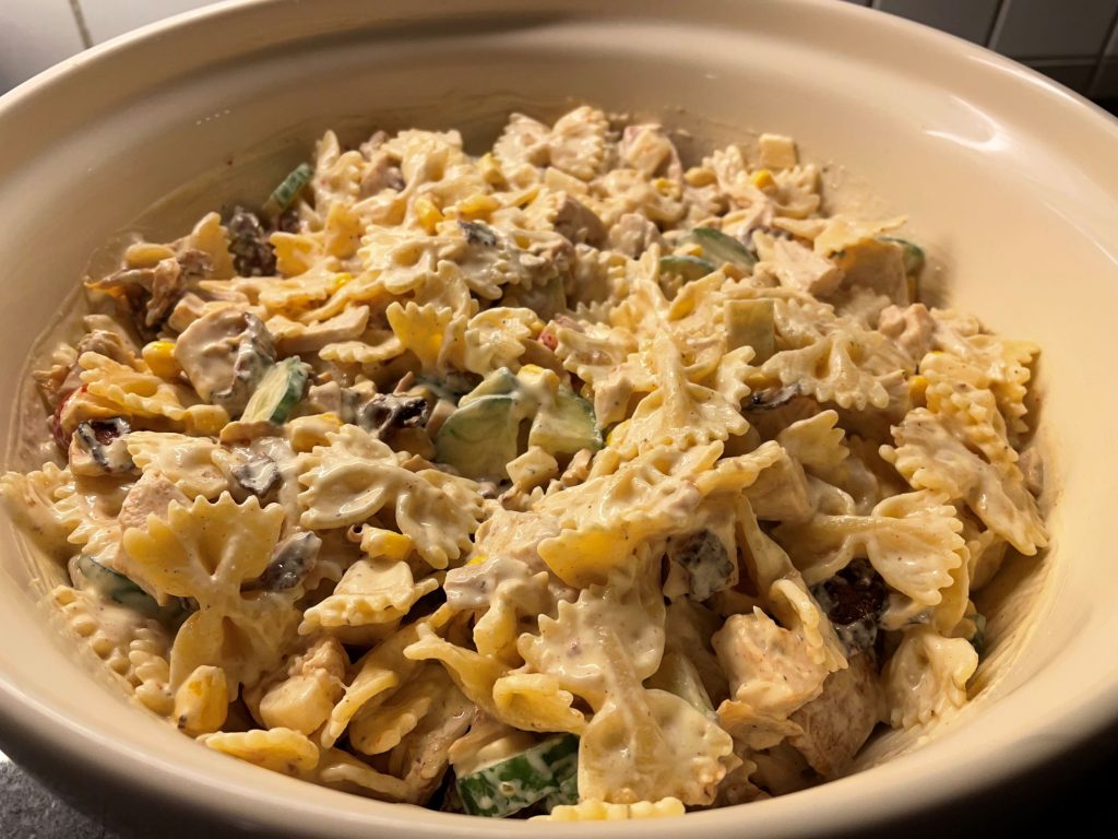 • Blanda den avsvalnade pastan med kycklingen, baconet, gurkan, tomaterna, majskornen, ev rödlök och den tärnade parmesanosten. Tillsätt majonnäs- och crème fraicheblandningen och blanda ordentligt.
