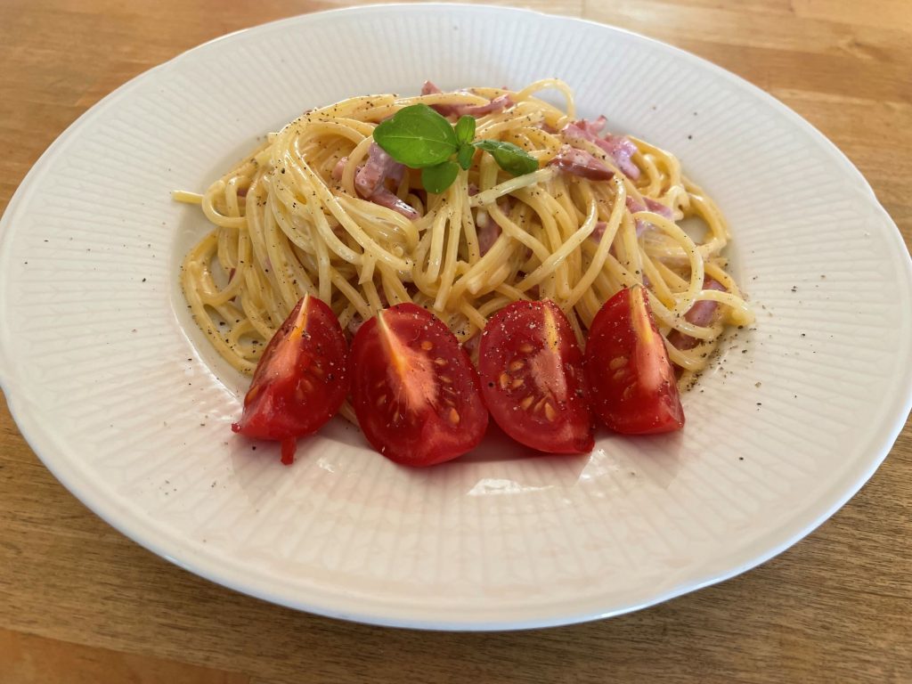 Med risk att kasta sten i glashus gör även jag ibland avsteg från originalet. Den här varianten av pasta carbonara frångår originalets få enkla ingredienser. Jag har tillsatt grädde för att få ytterligare krämighet. Dessutom använder jag en vitlöksklyfta samt lantbuljong – bara för att jag anser att det förhöjer smaken.