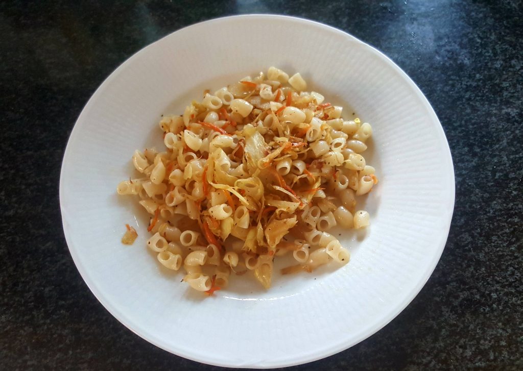 Den strimlade vitkålen bryns och blandas med pasta. Minns att min mor brukade peppra på ordentligt…