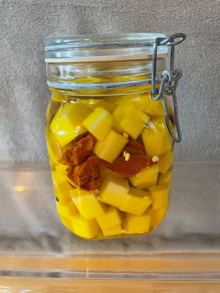 Jag är förtjust i olika typer av inläggningar. I det här fallet rör det sig om inlagd ost. Den är god till alltifrån en grillad köttbit till en plats på julbuffén.