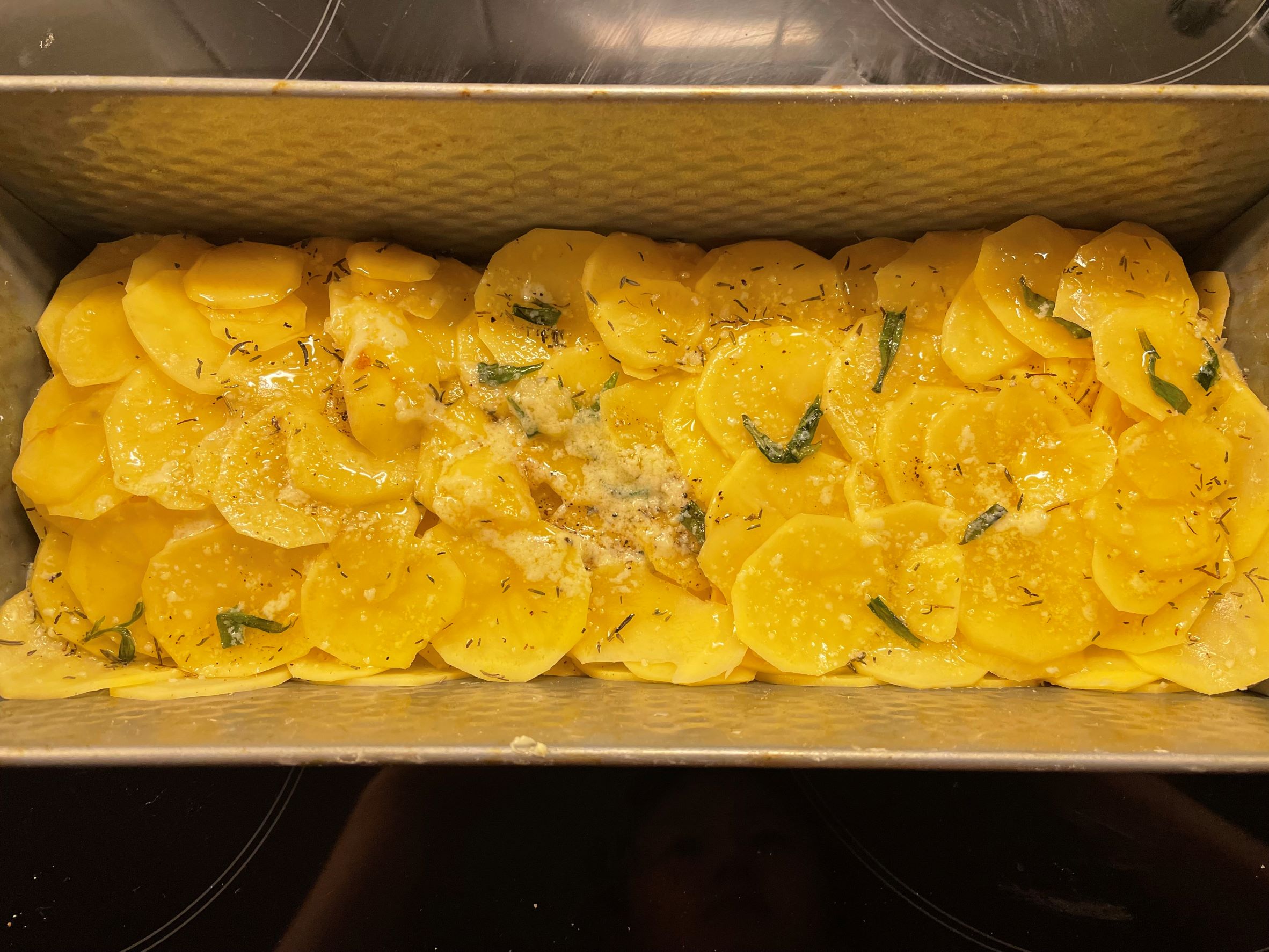 - Lägg den skivade potatisen omlott i en brödform eller bakform med löstagbar kant. Peppra och salta lätt mellan lagren. Salta inte för mycket.