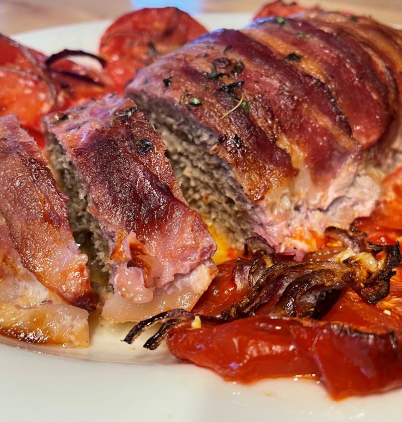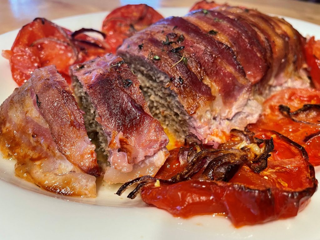 Köttfärslimpa täckt med bacon. Serveras med potatismos och gräddsås.