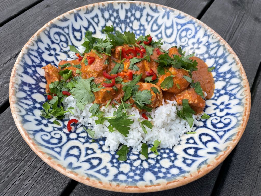 Indisk curryrätt med kyckling och tandoori- och garam masalakryddor. Hettan i rätten kan man variera enligt eget tycke och smak. Namnet ”butter chicken” kommer av att man i slutet av tillagningen lägger i en ordentlig mängd smör som bidrar till den silkeslena och mustiga currysåsen. Enligt uppgifter gjordes originalreceptet 1948 i de norra delarna av Indien. I Indien går den här rätten under namnet ”murgh makhani” vilket betyder kyckling med smör. I originalreceptet tillagas kycklingen genom att marineras och därefter stekas på hög värme innan den går ner i currysåsen.
