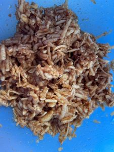 - Skala och kärna ur äpplena. Riv dem på grövsta falsen på ett rivjärn.