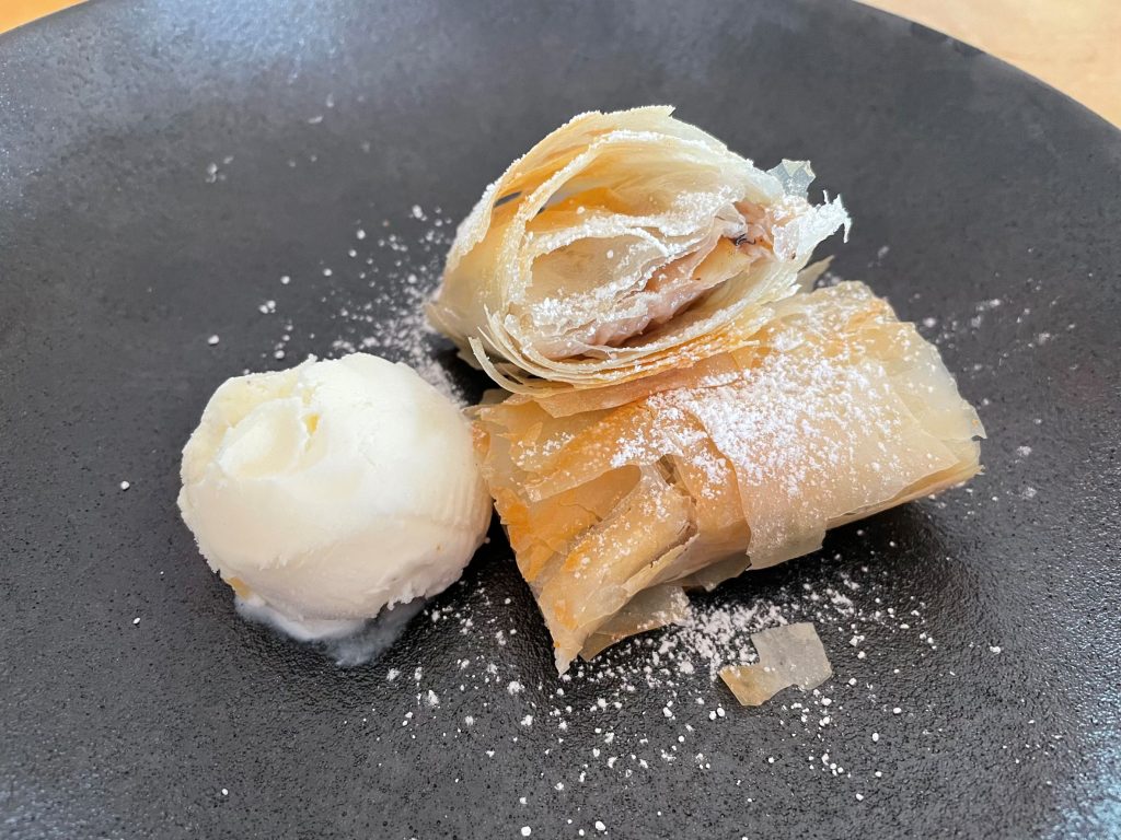 Pudra äppelstrudlarna med florsocker innan servering. Servera med en eller ett par skopor vaniljglass.