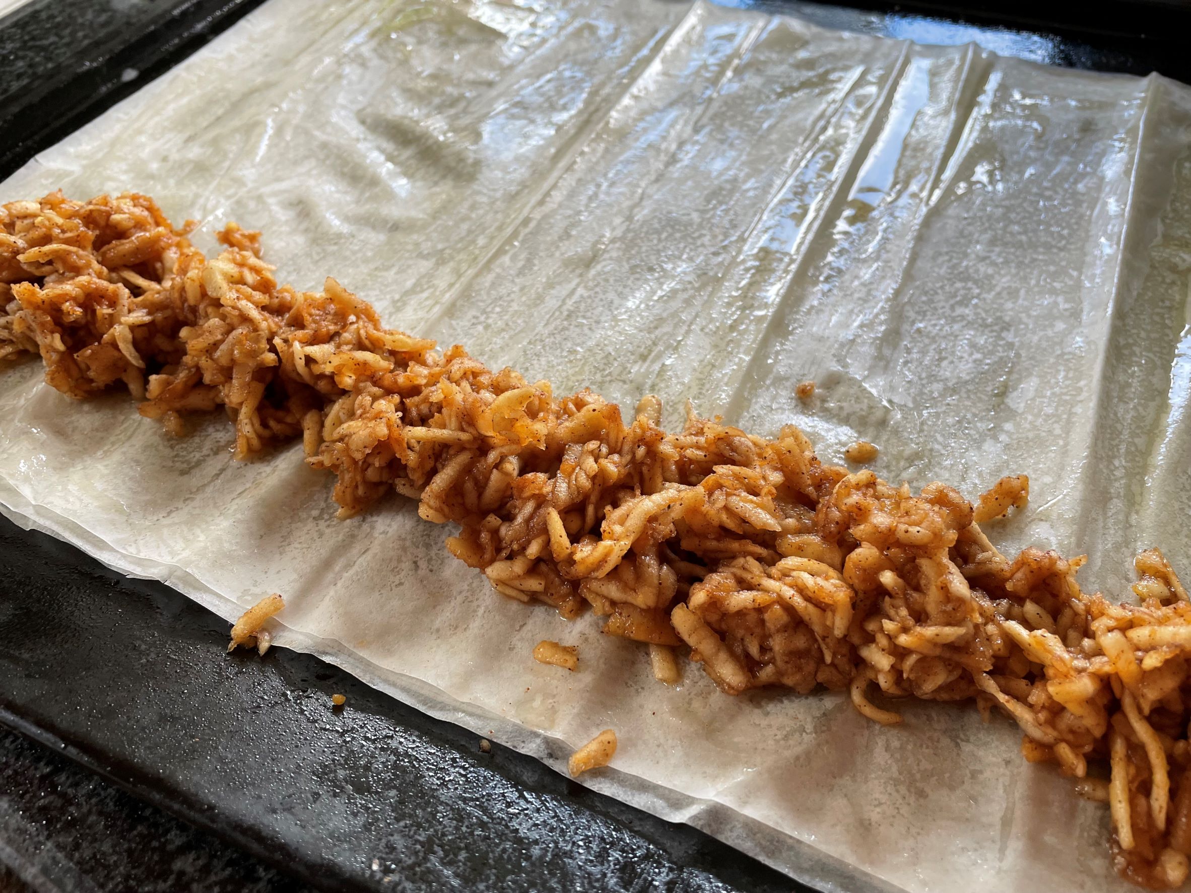 - Rulla försiktigt ihop filodegen från långsidan med äppelblandningen. Placera äppelrullen (strudeln) på en bakpappersförsedd ugnsplåt.