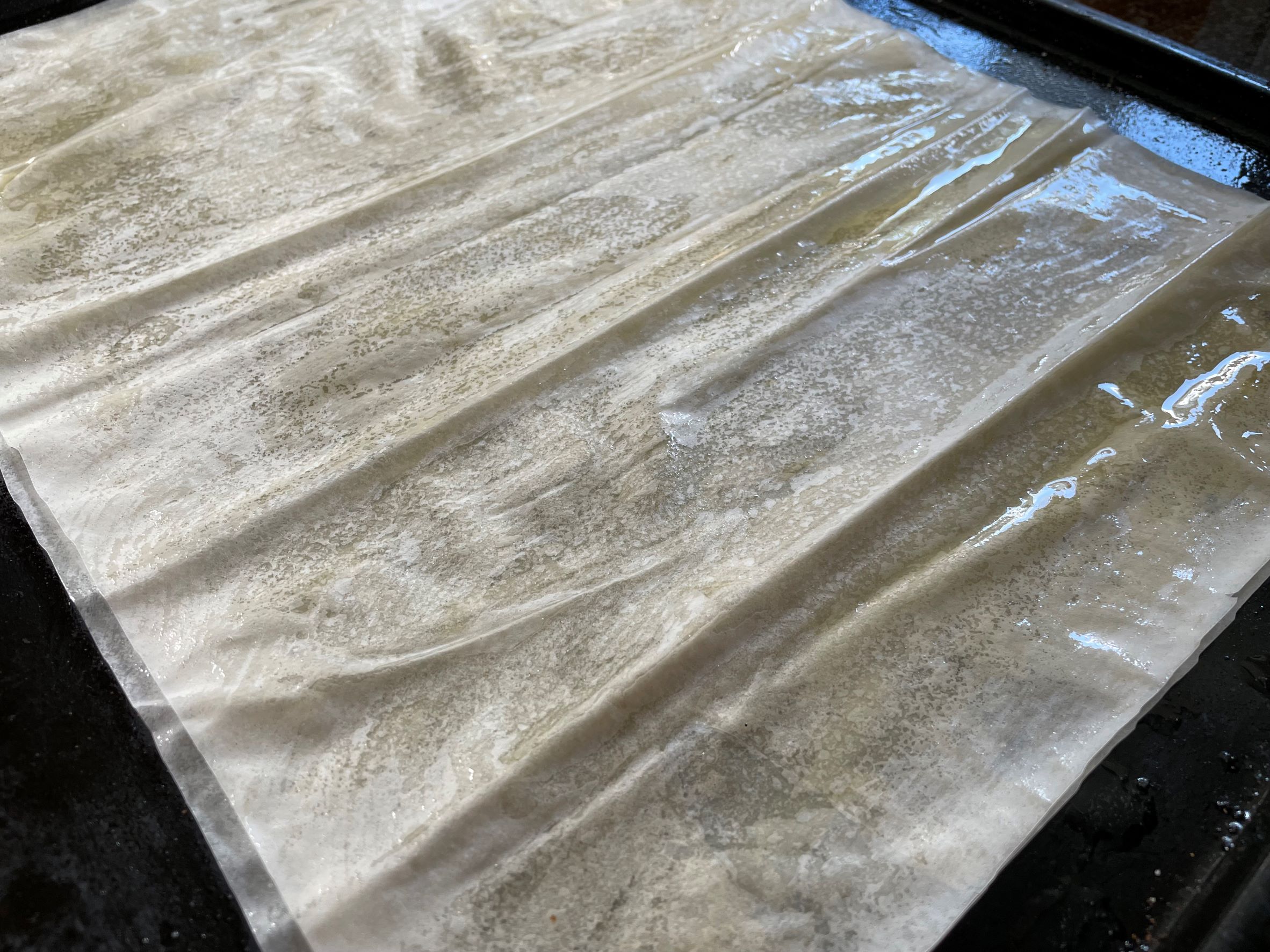 - Bred ut ett ark av filodegen och pensla med det smälta smöret. Upprepa tre gånger. Det ska vara 4 filodegsark med penslat smör.