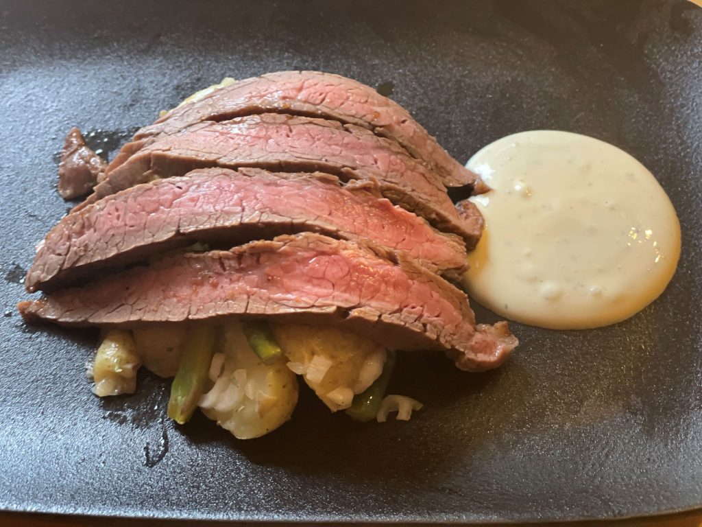 Jag tycker väldigt mycket om flankstek. Den ska helst vara grillad men att steka i stekpanna är nästan lika gott. Var noga med att inte översteka köttet för det blir lätt segt och tråkigt. Här har jag valt att servera flanksteken med en potatissallad samt en sås på béarnaisesås blandad med crème fraiche.