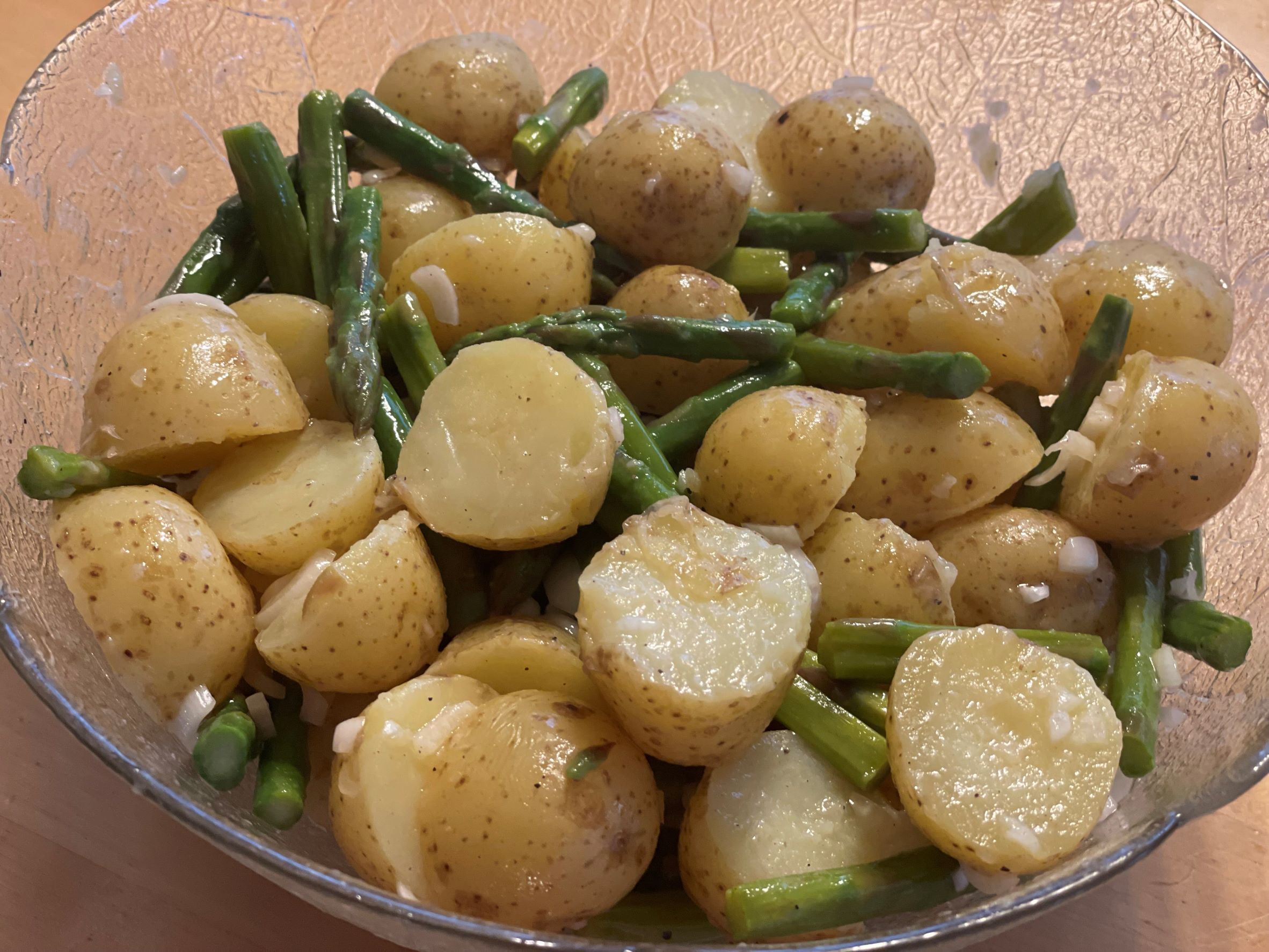 - Blanda potatis, sparris, salladslök, kapris, dragon och salladsdressing.