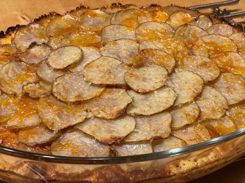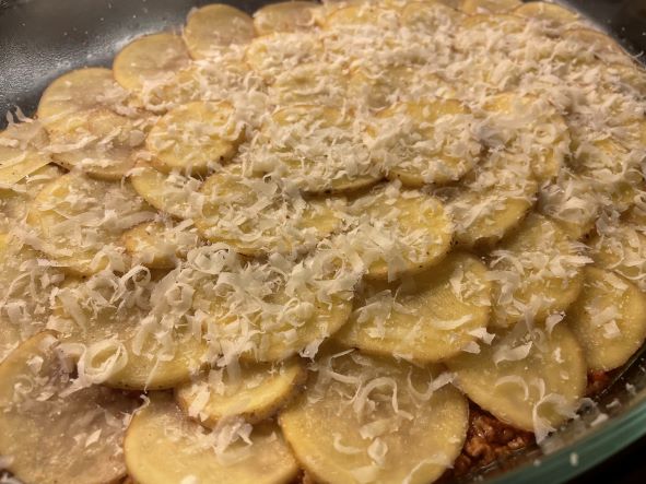 • Fördela resten av potatisskivorna över köttfärs- och parmesanosttäcket.