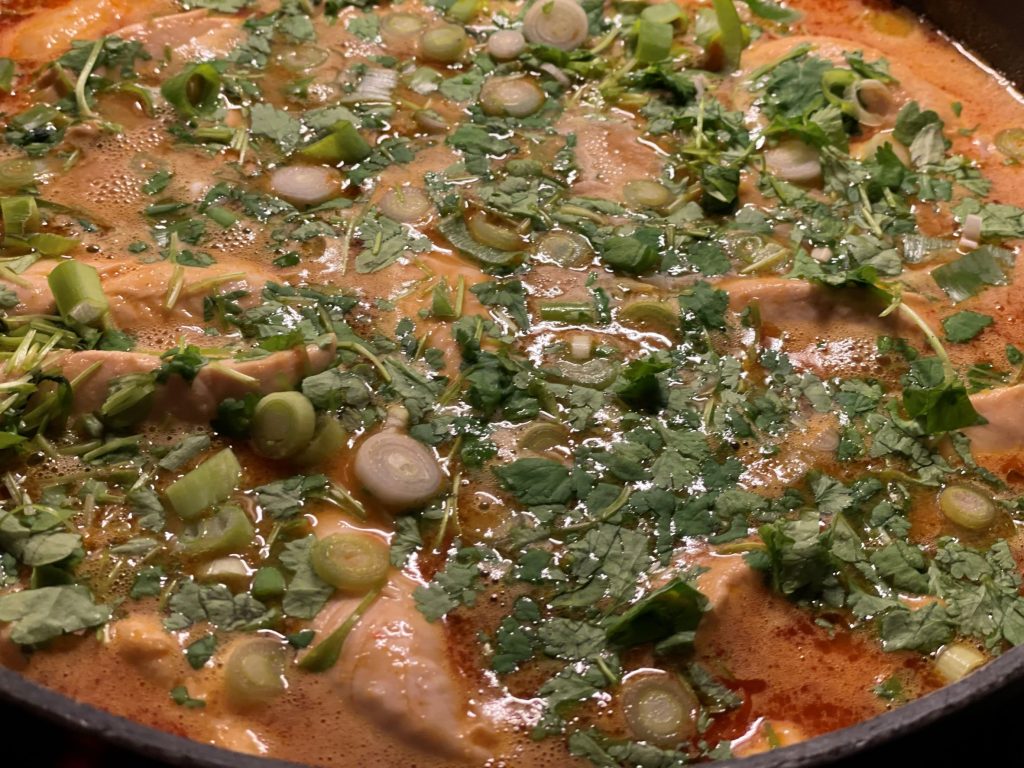 • Låt småputtra i currybasen under lock och på relativt låg värme tills kycklingen är genomkokt. Räkna med ca 8-10 minuter. Känn efter om de är genomkokta.