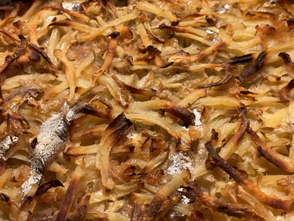 - Varva potatis, lök och ansjovis i en smord ugnsform. Se till att understa och översta lagret är potatis.