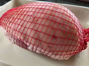 - Ta ut ugnsformen och låt skinkan svalna innan nätet tas bort. Skär bort svålen och lämna valfri tjocklek av fettet kvar på skinkan. Jag brukar trimma bort så mycket som möjligt men det är en smaksak.