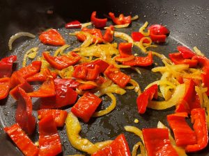 - Hetta upp en traktörpanna med 2 msk olja. Fräs lök och paprika på medel- till hög värme 3-4 minuter tills löken mjuknar något.