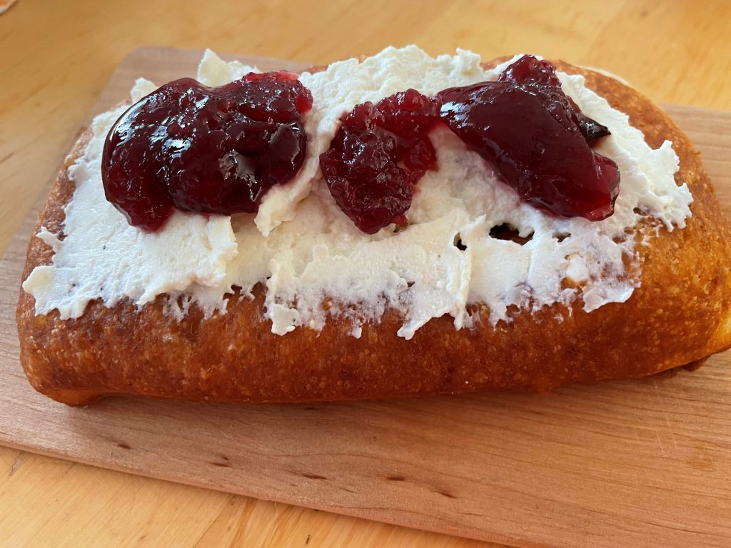 Friterad pizzadeg toppad med italiensk ostmassa och marmelad