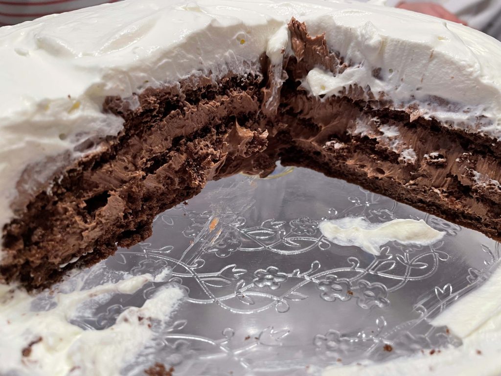 Tårtan är lätt att göra, speciellt om man köper färdiga tårtbottnar. Jag har valt att använda chokladtårtbottnar som täcks av smörkräm med smak av mörk choklad. Välj mörk choklad med minst 60% chokladhalt. Jag har valt att använda en blandning av choklad med 70 och 80% chokladhalt. Täck tårtan med vispgrädde smaksatt med vaniljsocker samt toppa med exempelvis hallon och/eller jordgubbar. Då jag inte hade några bär hemma fick det bli en tårta utan bär. Fotot på tårtan är inte världens bästa, men det är tårtan…