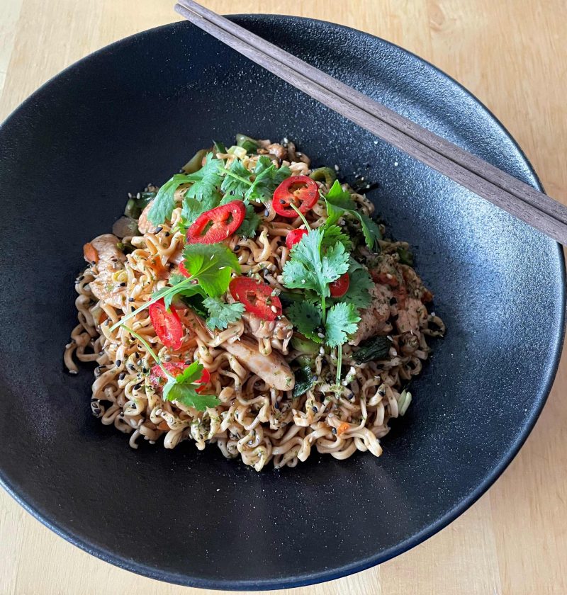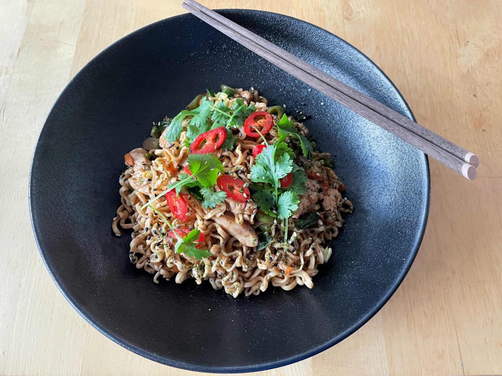Ät nudlarna som de är eller toppa dem med exempelvis koriander, chili eller kewpiemajonnäs. Strö gärna på furikake som är en japansk fröblandning på vita och svarta sesamfrön samt norialger.