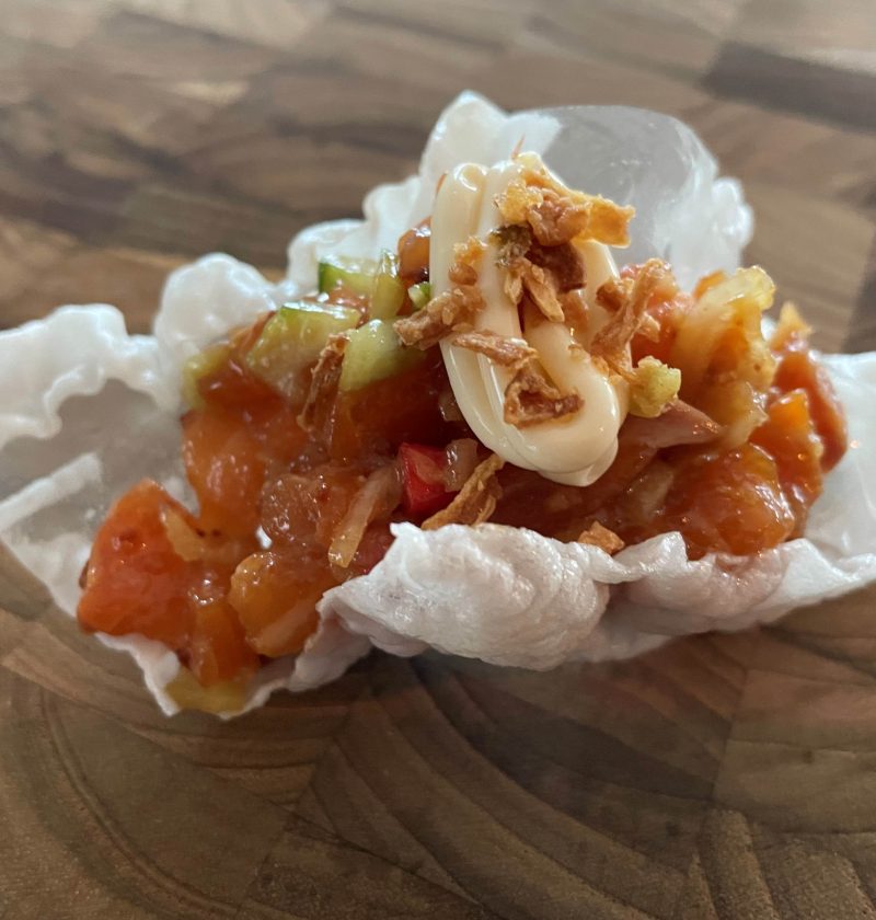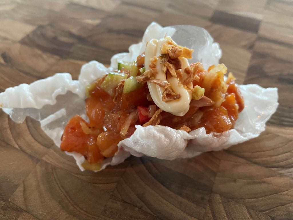 - Lägg ett par matskedar laxtartar på varje bit. Toppa med majonnäs samt rostad lök.