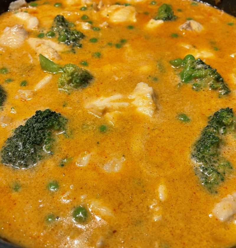 En het currygryta med fisk, broccoli och ärtor. Gott att äta med ris eller nudlar och toppat med koriander.