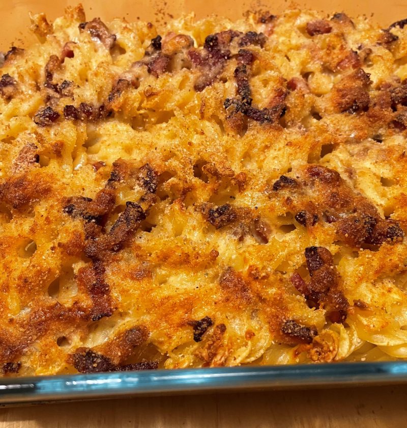 En enkel pastagratäng med sidfläsk. Ströbrödet gör att ovansidan får en härlig knaprighet. En tomat- och löksallad med syrlig vinägrett är gott till.