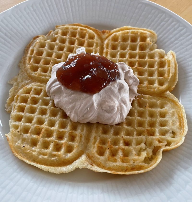 Frasvåfflorna är som namnet antyder något frasigare än de klassiska våfflorna. De kan med fördel serveras till glass och/eller vispad grädde och sylt eller bär. De är även goda toppade med salt topping så som kallrökt lax, löjrom, smetana eller crème fraîche och rödlök. Bilden visar våffla med chokladgrädde och jordgubbssylt. Chokladgrädden görs genom att …