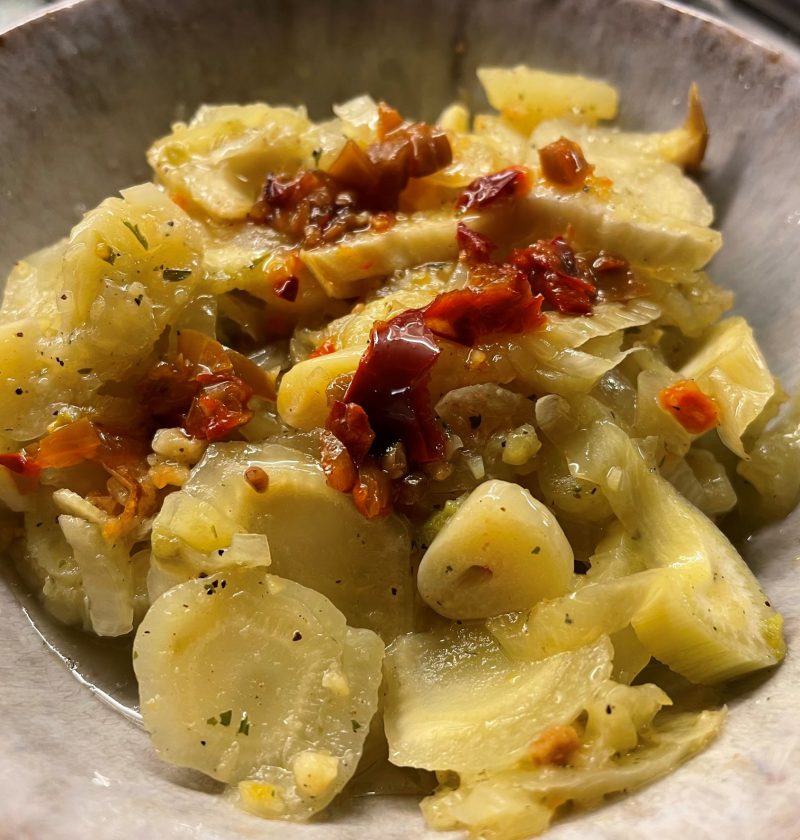 Konfiterad fänkål som är god att servera med exempelvis stekt eller grillad fisk.