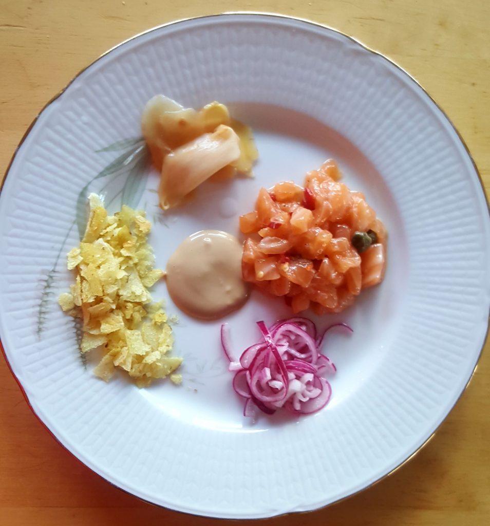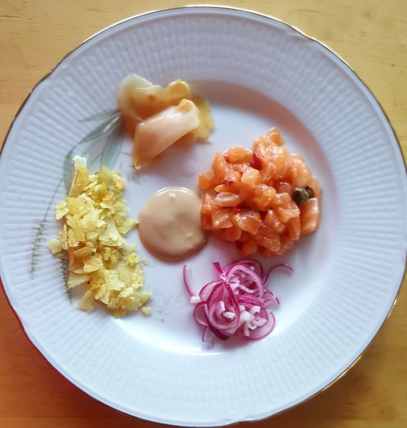 Det här är en enkel laxtartar med asiatisk touch. Serveras med picklad rödlök som smakar godast då den har fått stå och dra några timmar, helst över natten. Potatischipsen ger en god krispighet till helheten. Jag tycker om kapris men det gör inte hela familjen. Kaprisen ger en god sälta till tartaren men kan uteslutas om …